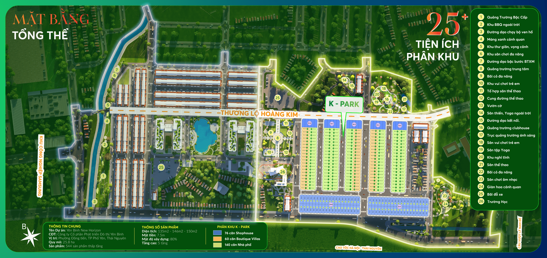 Phân Khu Yên Bình New Horizon với quy mô 25,8 ha bao gồm: hơn 544 sản phẩm thấp tầng, 2 tòa chung cư với 1400 căn hộ.