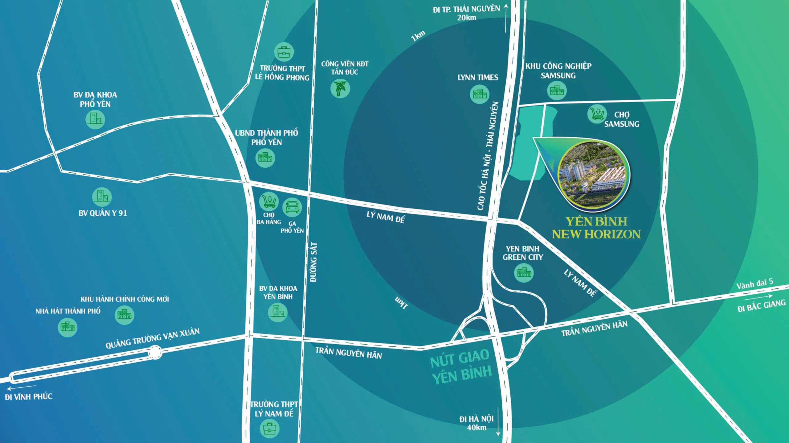 Yên Bình New Hozizon sở hữu vị trí chiến lược tại nút giao Yên Bình, cửa ngõ thành phố Phổ Yên. Đây là một trong những nút giao thông quan trọng, kết nối trực tiếp với nhà máy Samsung, tạo ra sự thuận lợi tối đa cho việc di chuyển và giao thương.